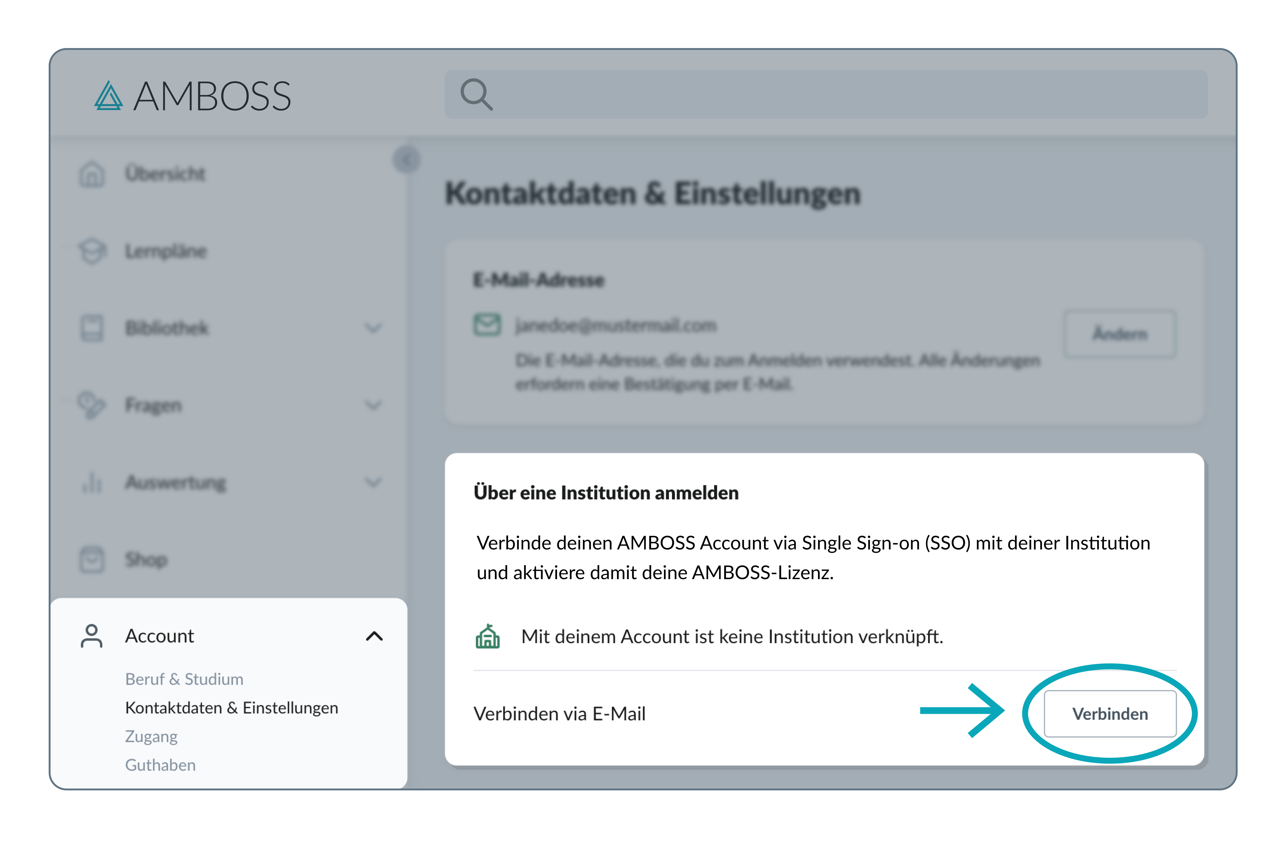 Nach erfolgreicher Registrierung ist die Campuslizenz deiner Institution automatisch in deinem Account hinterlegt. Du kannst dies anschließend in AMBOSS unter “Kontaktdaten & Einstellungen” einsehen.