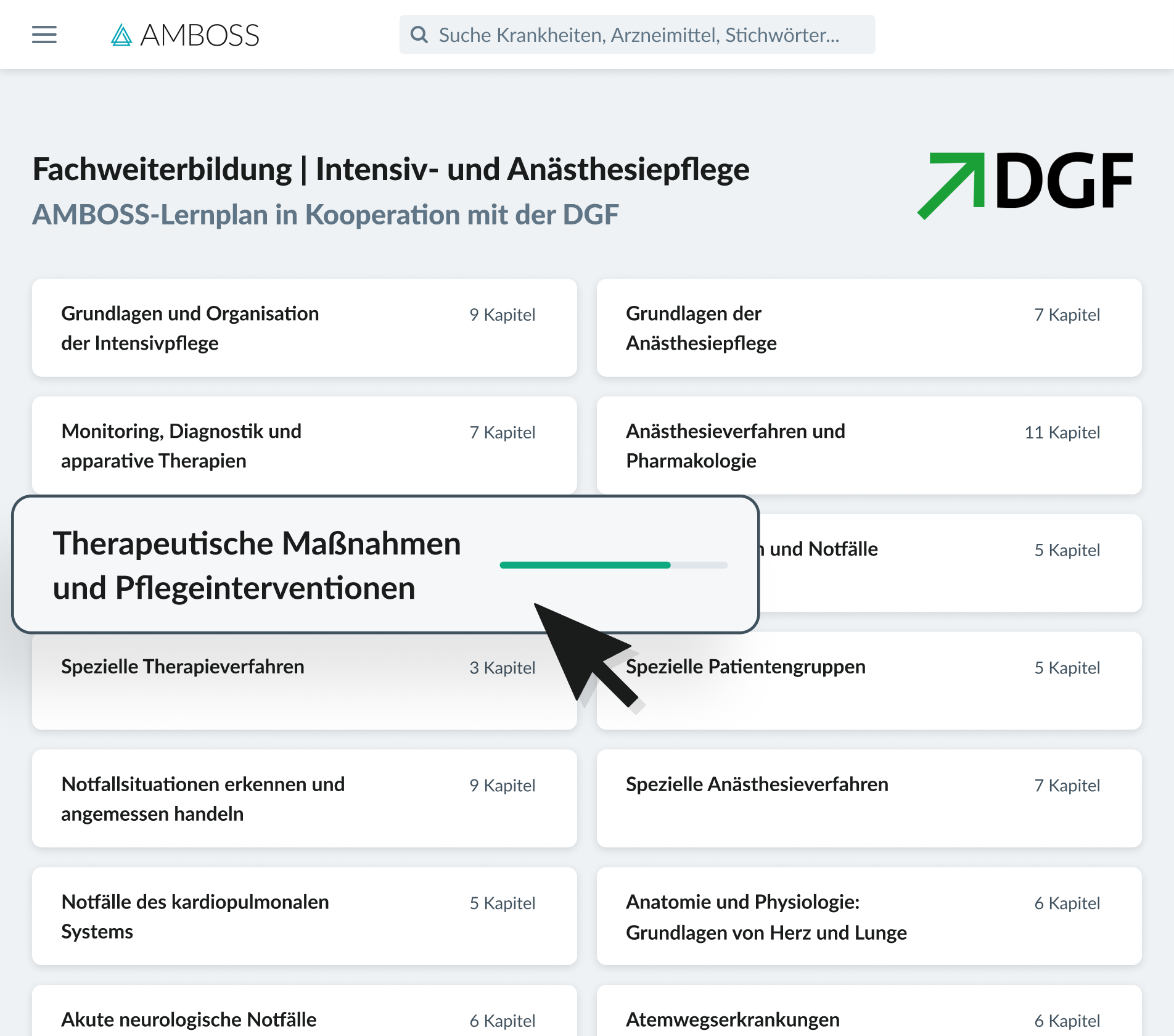 Gemeinsam mit unserem Partner, der Deutschen Gesellschaft für Fachkrankenpflege und Funktionsdienste e.V. (DGF), haben wir einen AMBOSS-Lernplan zur Fachweiterbildung Anästhesie- und Intensivpflege entwickelt. Der Plan dient als Orientierung für die strukturierte Aufbereitung der zentralen Themen und wird kontinuierlich weiterentwickelt. Je nach Vorwissen, praktischer Erfahrung, individuellen Schwerpunkten und den Vorgaben des jeweiligen Weiterbildungsinstituts lassen sich unterschiedliche Akzente setzen.Der Lernplan ist kostenfrei in jedem aktiven AMBOSS-Zugang enthalten (z. B. AMBOSS-Pflege-Abo oder Kliniklizenz).